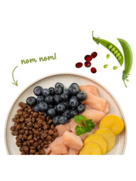 świeże mięso z kurczaka (20%), kukurydza, białko drobiowe (suszone), tłuszcz zwierzęcy, skwarki (suszone), świeża jagnięcina (4%), ryż (4%), białko kukurydziane, hydrolizat białka, suszony miąższ buraczany (bez cukru), mąka ryżowa, siemię lniane, mączka wątrobowa, olej z łososia (0,5%), węglan wapnia, chlorek potasu, borówki brusznice (suszone, 0,1%), borówki (suszone, 0,1%), pietruszka (suszona, 0,1%), drożdże (suszone, 0,1%), kwiaty nagietka (suszone, 0,05%).